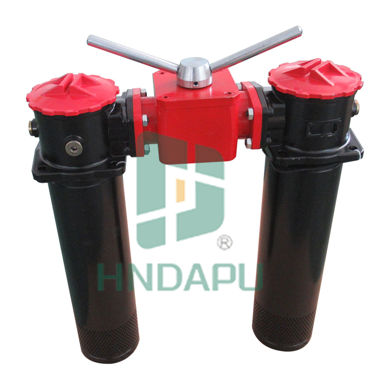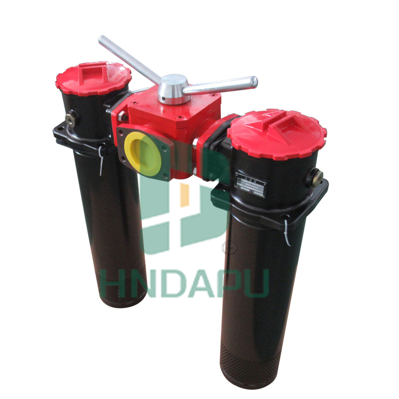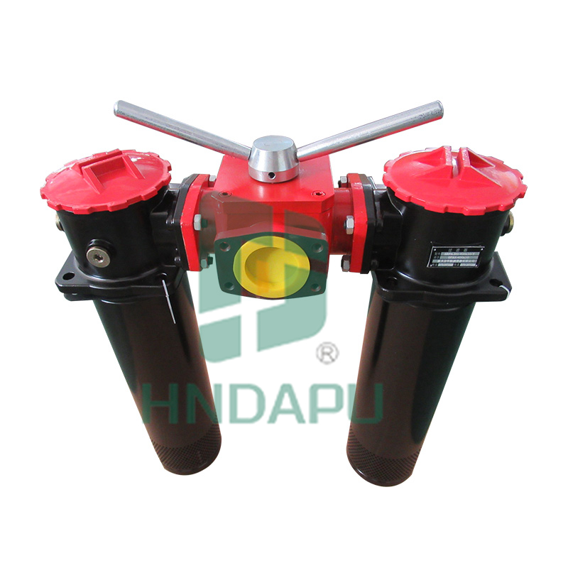 該過濾器是有兩只單筒過濾器,換向閥,旁通閥,發訊器,擴散器等組成。它被安裝在油箱頂部,可在系統不停機的情況下更換濾芯,適用于連續工作的液壓系統回油精過濾,用來濾除系統中諸元件磨損產生的金屬。當一只過濾器的濾芯堵塞致使進出油口壓差達到 0.35MPa 時,發訊器發訊,這時轉動換向閥,使備用濾油器工作,然后更換已堵塞的濾芯。連接方式分為螺紋和法蘭接口。